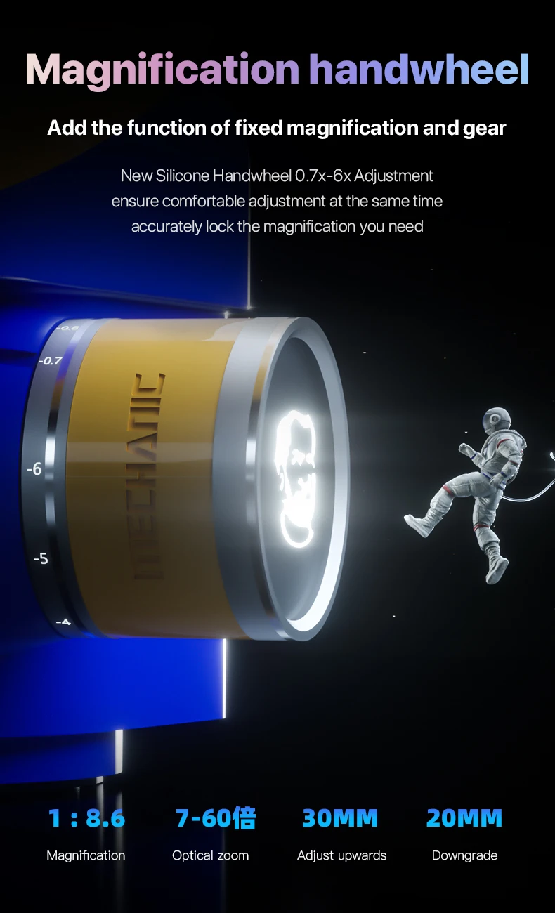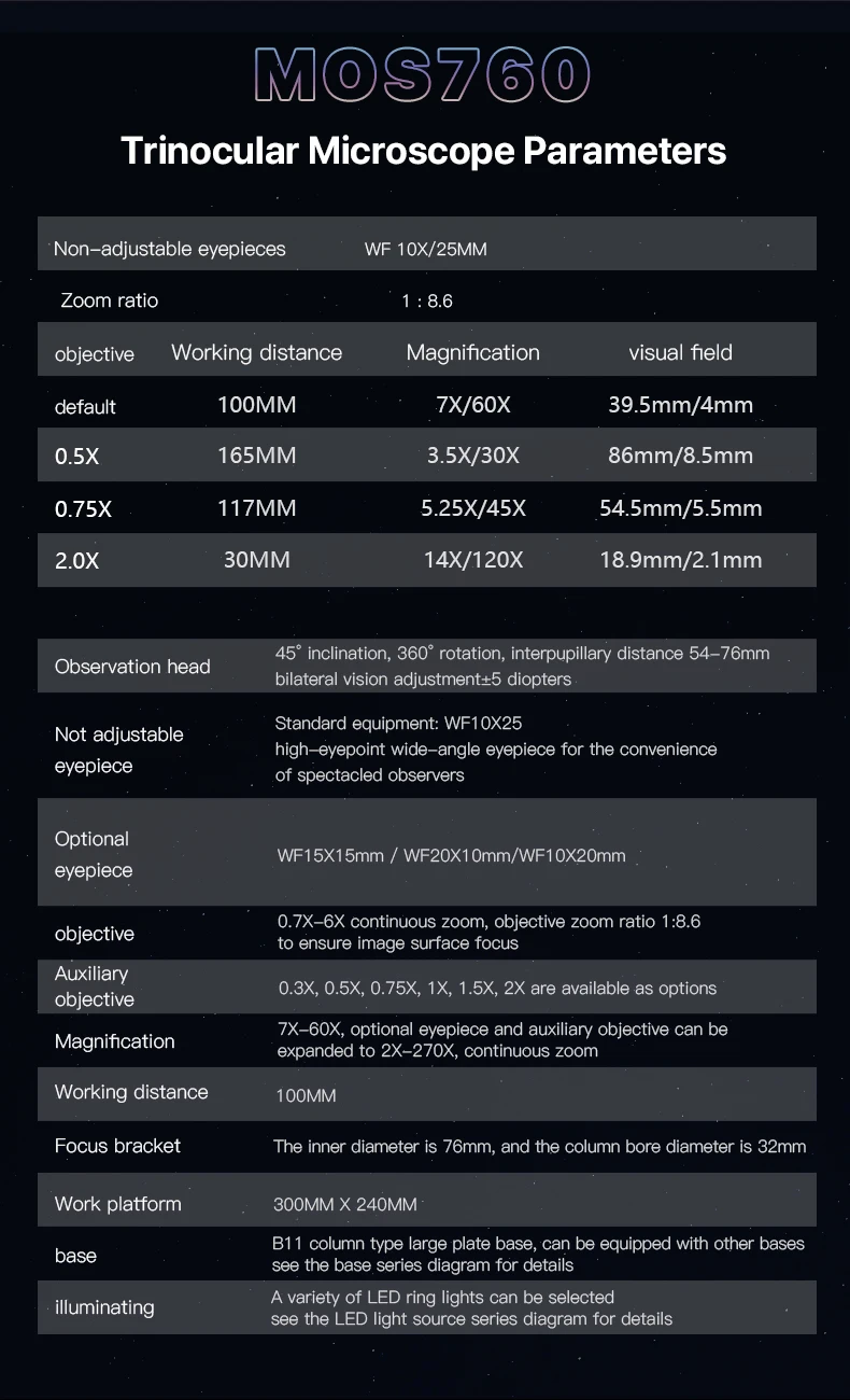 0.6-4.5X continuous zoom, optical system, large magnification continuous zoom, sharp imaging, and no distortion, very high definition, can correctly focus on samples with large uneven surfaces, so as to obtain a three-dimensional image.