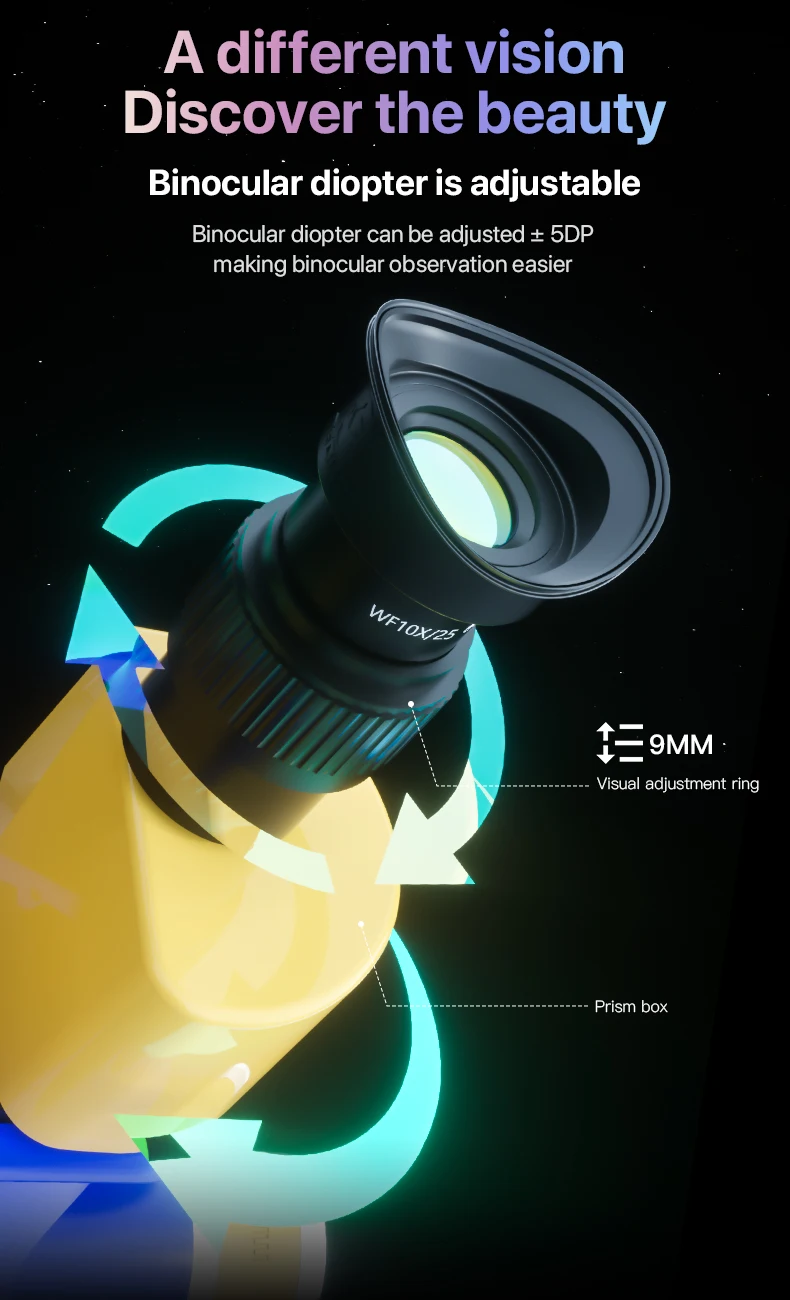 With the high field of view wide-angle eyepiece, standard WF10X/25MM, it is still convenient to wear glasses for observation