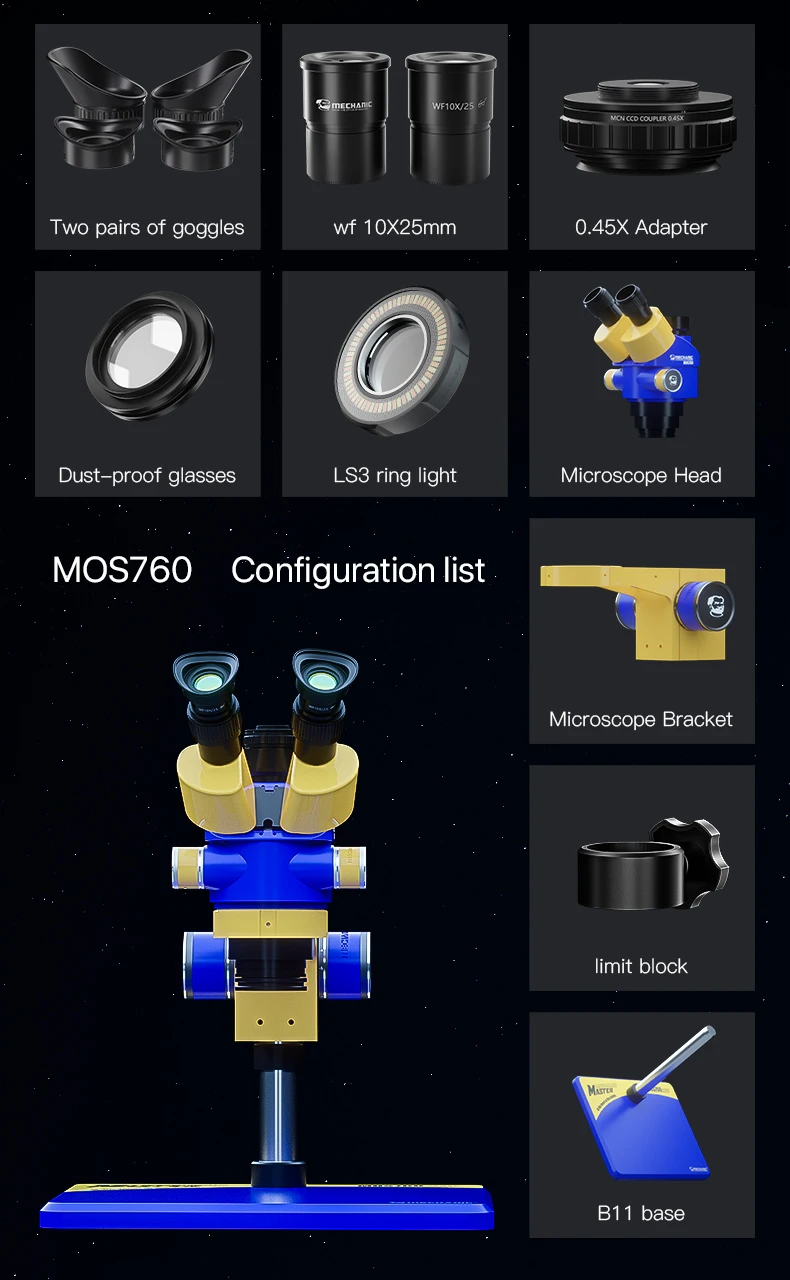 MECHANIC MOS760-B11 microscopio Stereo trinoculare HD componente elettronico ingrandito 0.7-6.0X Zoom mirino di osservazione